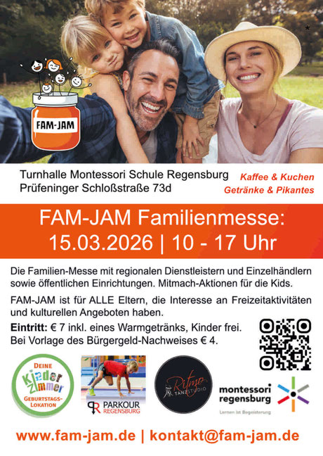 Wir veranstalten Familien-Messen mit regionalen Dienstleistern und Einzelhändlern sowie öffentlichen Einrichtungen. FAM-JAM richtet sich an ALLE Eltern, die Interesse an Freizeitaktivitäten und kulturellen Angeboten für ihre Kinder in und um Regensburg haben.